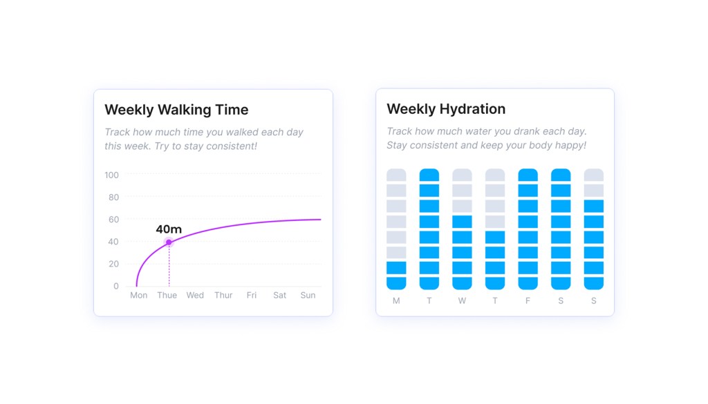 Motivation — Progress bars, streaks, and data cards that celebrate small wins.
